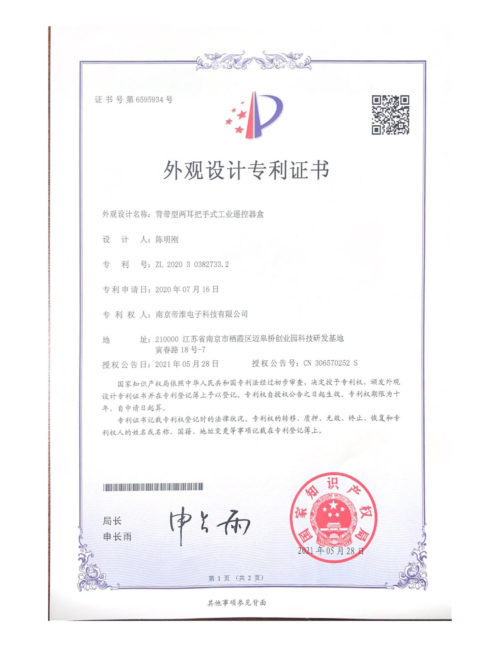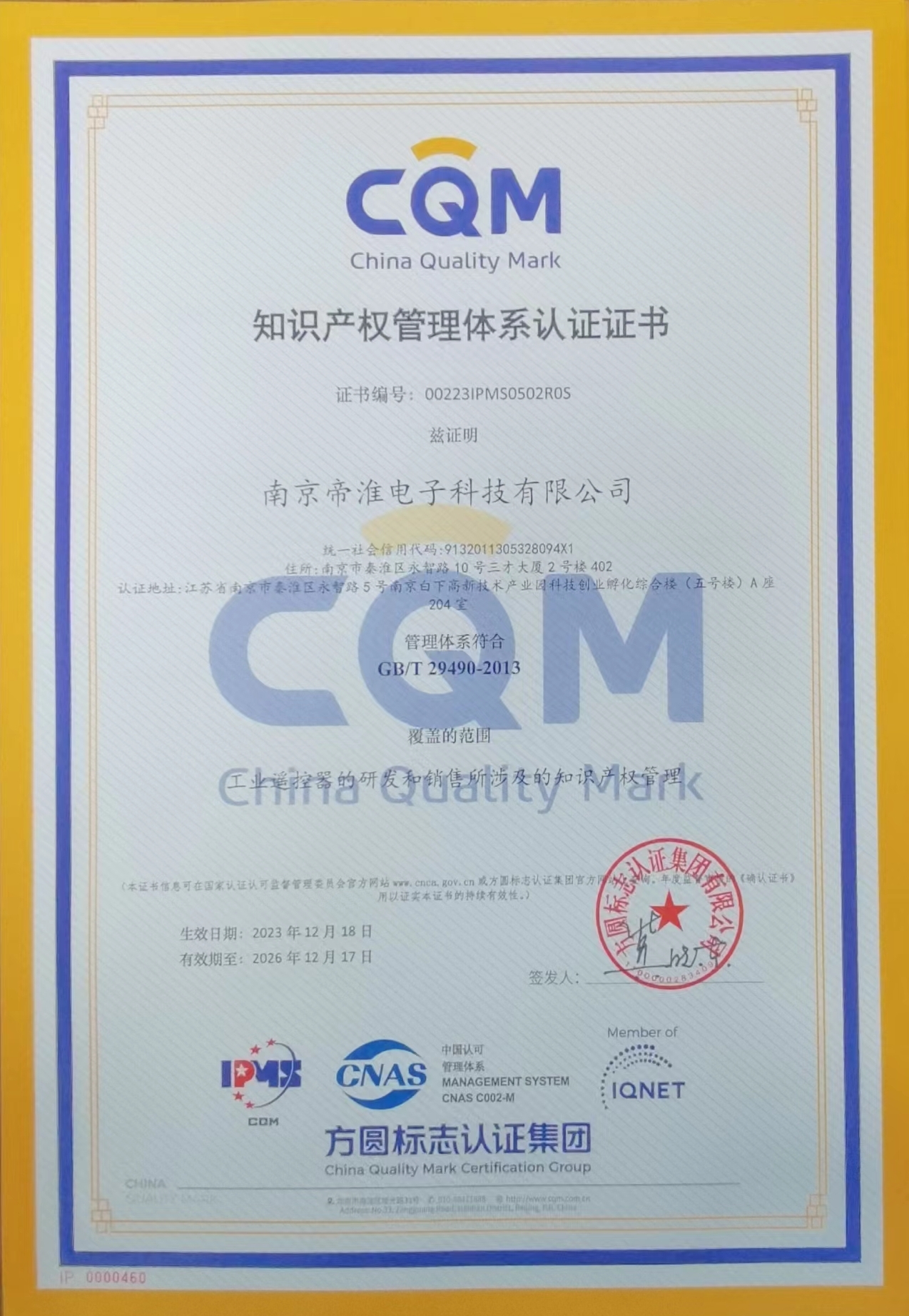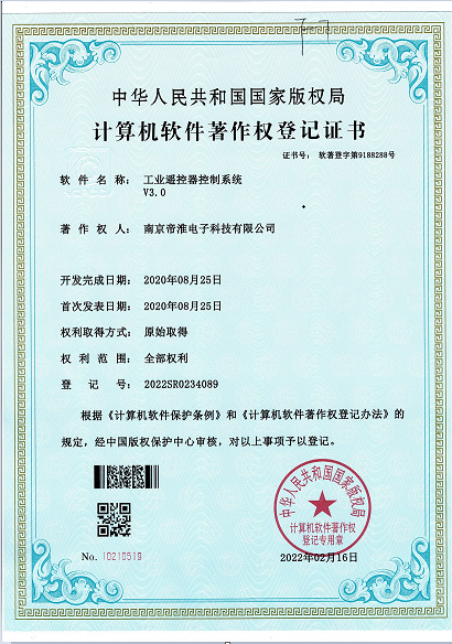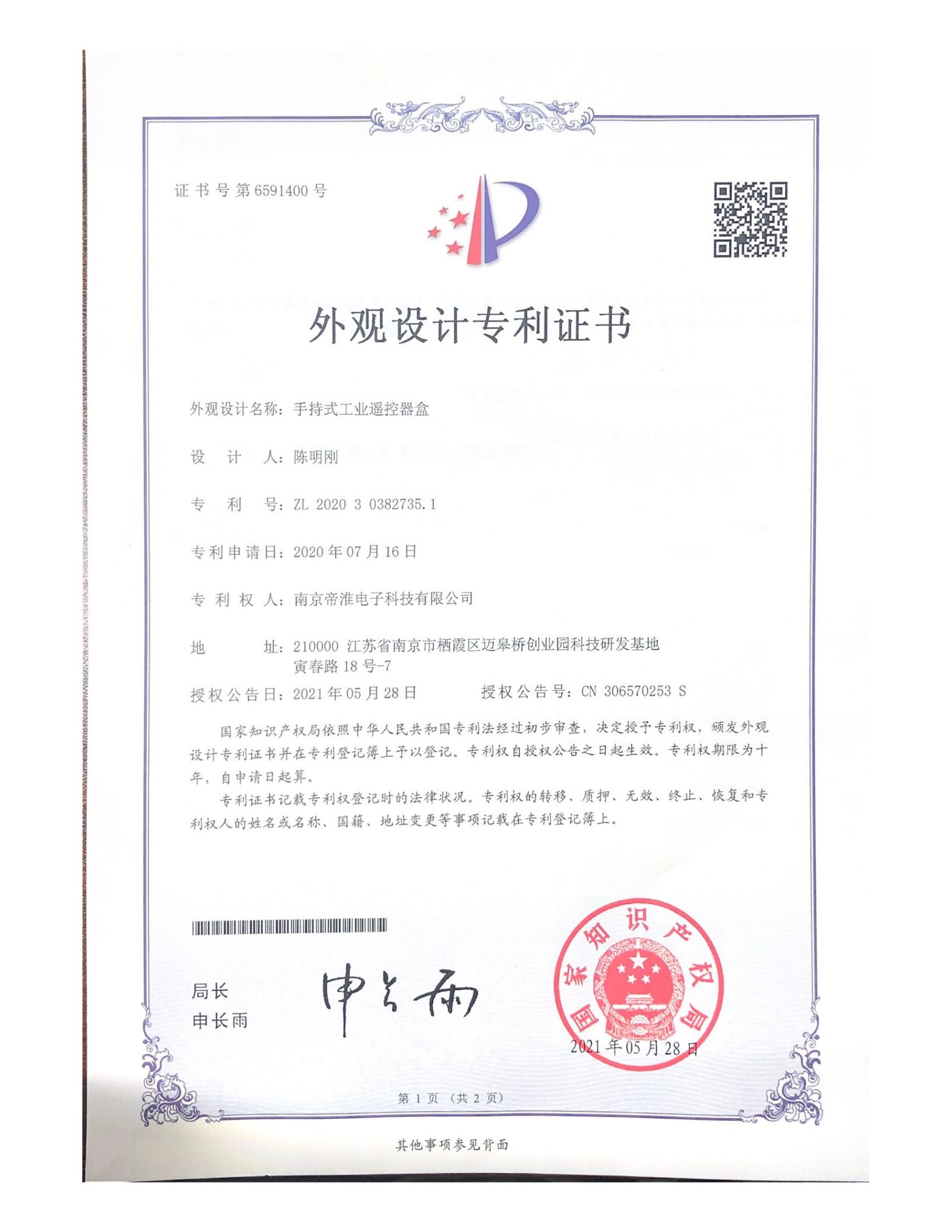 南京帝淮电子科技有限公司,国内工业??仄餍幸盗炀笠担灾餮蟹ⅰ⒍ㄖ啤⒎潜晟杓聘骼喙ひ导段尴咭?仄鳌⒐ひ导队邢呖刂破鳌⒅悄芑灾魉惴呒谋镜乜刂破鞯认盗胁?。已经申请及正在申请的技术专利、外观专利有近三十项左右,并通过了CE欧盟认证、国家级试验检验报告、EMC电磁兼容认证等。